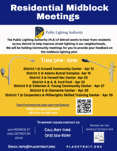 Before finalizing the lighting plan, the City of Detroit and the PLA will host community input meetings in every City Council district during the month of April. At these meetings, residents will have the opportunity to: